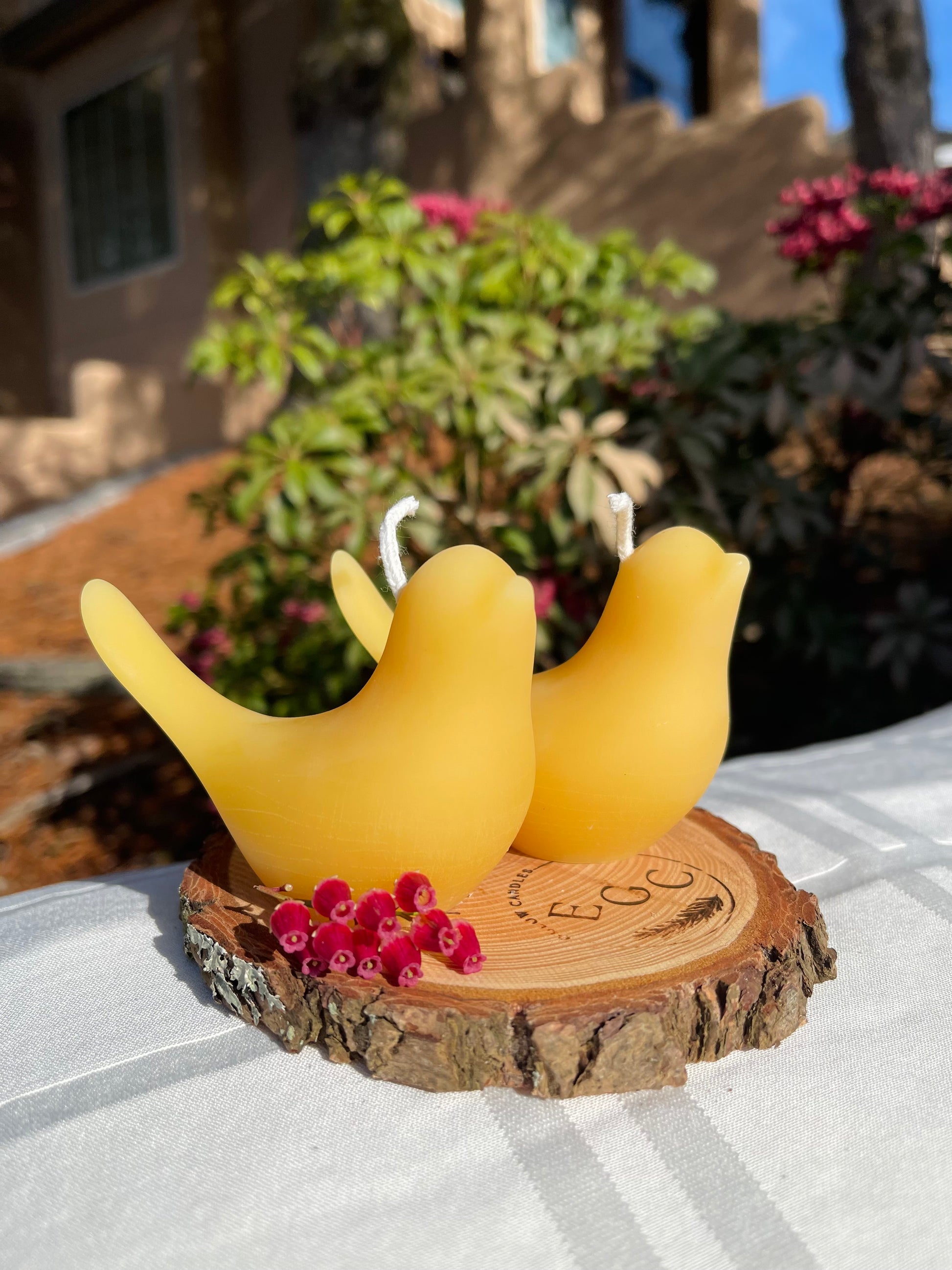 These handmade 100% beeswax sparrow pair candle set are a beautiful blend of nature and artistry. Their warm, golden hue and smooth finish make them a charming addition to any space with a touch of midnight jasmine scent.